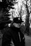 In the eerie stillness of the woods, a hooded figure senses an unseen presence lurking in the shadows.
