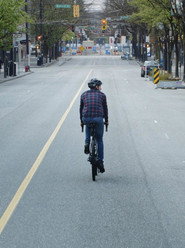 When society shifts abruptly into pandemic low gear, a lone cyclist embarks on a tour that begins with shuttered shops and empty streets, and ends with a city opening up to a new reality.